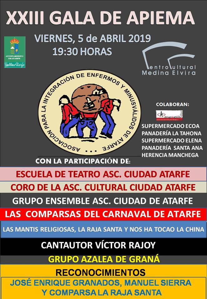 Mañana, viernes, se celebra en el Centro Cultural Medina Elvira la XXIII edición de la Gala de la Asociación Apiema Atarfe con la participación de la Escuela de Teatro, el coro y un grupo de ensemble de la Asociación Artística y Cultural Ciudad Atarfe , las comparsas del carnaval, el cantautor Víctor Rajoy y el grupo Azalea de Graná.