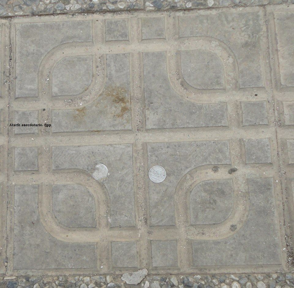 Pues bien, en el centro de la Calle hay una baldosa con dos pesetas, que de algún modo entraron en el proceso de fabricación de la loseta, quedaron atrapadas en el interior de la pieza. Los chiquillos cuando las ven pretenden cogerlas sin llegar a tener éxito.