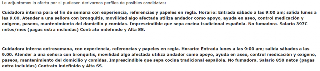 Cabe recordar que en España es ilegal racializar o sexualizar las ofertas de trabajo demandando únicamente a hombres o mujeres para cubrir una vacante. No obstante, este tipo de empresas excusándose en que no son ellas, sino las personas particulares las que eligen a los trabajadores, tienen licencia total para publicar ofertas en las que demandan mujeres migradas con unas capacidades –como la cocina tradicional española– que denotan claramente el origen deseado. Asimismo, argumentando que ellos no deciden las condiciones salariales y contractuales propuestas por las familias demandantes de servicios de cuidados, no tienen el más mínimo pudor de publicar ofertas de trabajo que exceden las 40 horas semanales y sin alcanzar siquiera el Salario Mínimo Interprofesional. Arguyendo que ellas no seleccionan para su empresa sino para particulares (personas físicas) que no están sujetos a las mismas restricciones que las empresas en los procesos de selección, consiguen abrir la veda y saltarse cualquier protección legal, por mínima que sea.