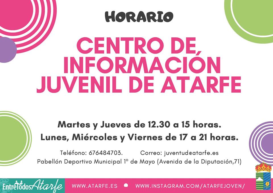Los horarios del Centro de Información Juvenil de Atarfe han cambiado. Os dejamos aquí sus datos por si necesitáis poneros en contacto con dicho área