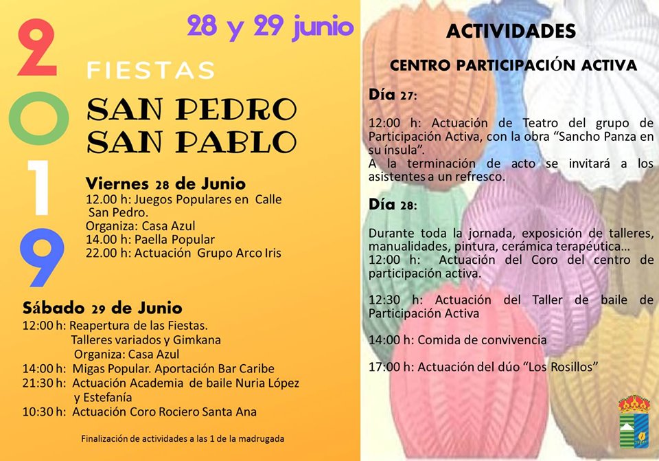 Colaboran LA CASA AZUL, BAR CARIBE, DUO LOS ROSILLOS, ACADEMIA DE BAILE NURIA LÓPEZ Y ESTEFANIA, EL CORO ROCIERO SANTA ANA Y EL GRUPO ARCO IRIS