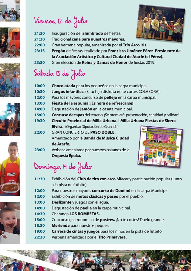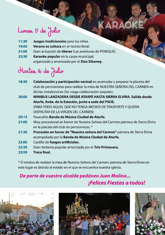 Un año más, con motivo de la Virgen del Carmen, se celebran las tradicionales Fiestas de Sierra Elvira. Esta edición del 12 al 16 de Julio. Os adelantamos el programa de actividades.