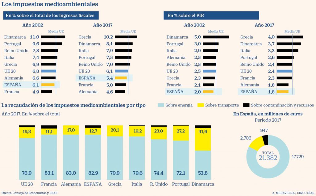En conjunto, España recaudó 21.382 millones con tributos medioambientales en 2017, demostrando una especial dependencia del impuesto de hidrocarburos, que arrojó 13.156 millones a las arcas públicas (pese a que las deducciones rebajan los ingresos en 850 millones). Aporta un 74% de toda la recaudación de impuestos a la energía y un 61,5% del total de tributos medioambientales. Le sigue en importancia el Impuesto sobre Vehículos de Tracción Mecánica, con 2.225 millones (de los que los particulares abonan 1.838 y las empresas el resto), el 10% del total.