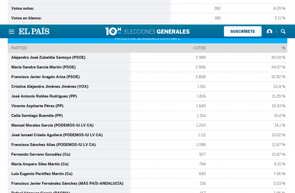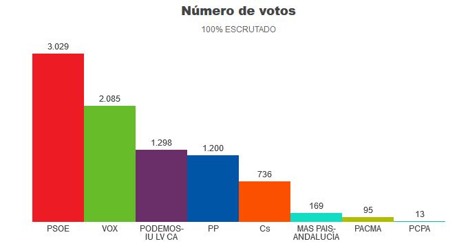 De acuerdo a los datos ofrecidos por el Ministerio del Interior, la formación que lidera Pedro Sánchez habría conseguido la primera plaza gracias al 34,56% de los votos. En segunda posición estaría Vox (23,79%), con 2085 votos; seguido de Unidas Podemos (14,81%), con 1298; mientras que el PP y Cs habrían conseguido un 13,69% y 8,4% respectivamente.