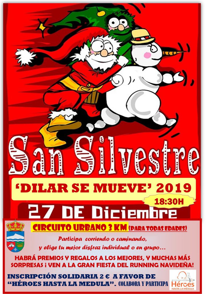 Viernes 27 de diciembre, II San Silvestre Solidaria Dílar. 3 kms, salida a las 18.30 horas, precio 2 €, a favor de la Asociación Héroes hasta la Médula, controlada por CRONOMETAVOLANTE.