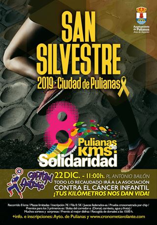 Domingo 22, San Silvestre de Pulianas. 8 kms, salida a las 11 horas, precio 7€ destinados a la Asociación Contra el Cáncer Infantil “Capitán Antonio”, cronometrada por CRONOMETAVOLANTE.