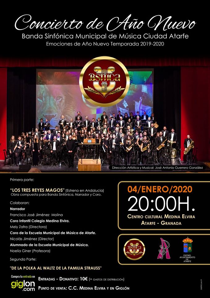 El próximo día 4 de Enero de 2020 a las 20:00 horas, en el Centro Cultural Medina Elvira, tendrá lugar el tradicional Concierto de Año de Nuevo ofrecido por la Banda Sinfónica Municipal de Música Ciudad Atarfe.