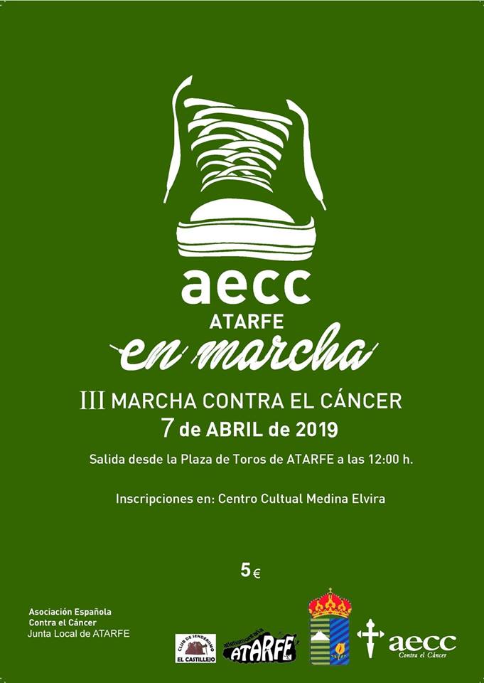 Quedan todavía muchos días para la III Marcha contra el Cáncer que organiza la agrupación local de la AECC de Atarfe en colaboración con el Ayuntamiento de Atarfe, el Club Atletismo y Montaña y el Club de Senderismo El Castillejo, pero conviene que os inscribáis ya en el centro cultural para reservar la camiseta conmemorativa. Solo cuesta 5 euros. La recaudación se dedicará a la investigación en la lucha contra esta enfermedad. NO TE OLVIDES EL DIA 7 DE ABRIL TIENES UNA CITA