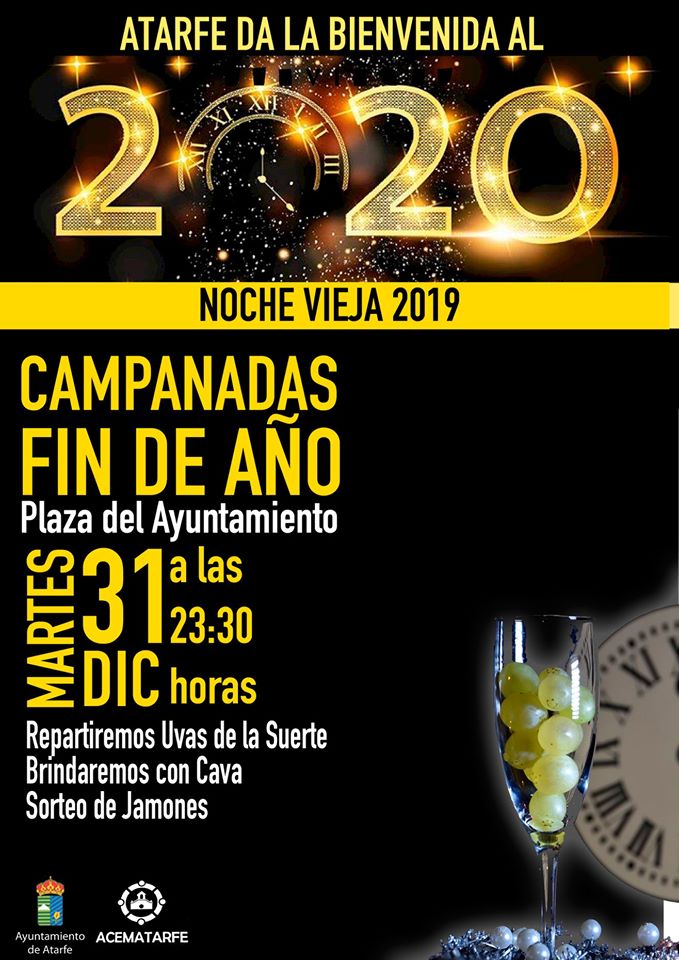 Este año el Ayuntamiento nos convoca en la Plaza del Ayuntamiento, para recibir tod@s junt@s, el próximo año 2020. A partir de las 23: 30 horas repartira las uvas de la suerte, brindaremos con cava y se sortearán jamones.