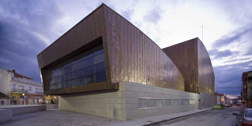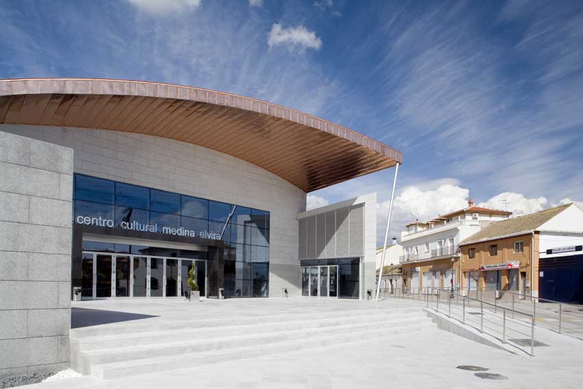 El Centro Cultural Medina Elvira de Atarfe se concibe como un gran edificio formado por dos piezas funcionalmente independientes (Auditorio-Casa de la Cultura).