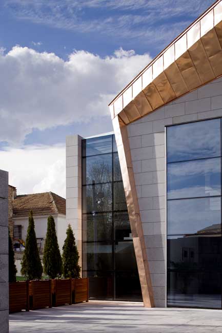 La disposición de las mismas se ha visto muy limitada por la forma triangular del solar. Un volumen inclinado que asoma hasta el nuevo espacio público, marca el acceso al complejo y abre un vacío en el interior de la edificación (el patio central). Las dos grandes piezas anteriormente mencionadas se apoyan sobre un zócalo continuo en toda la edificación donde se encuentran las circulaciones y dependencias.FECHA INICIO / FINALIZACIÓN: 2001/2007