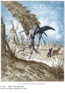 Don Quijote lucha contra un molino de viento pensando que es un gigante. Grabado coloreado basado en uno de Gustave Doré.