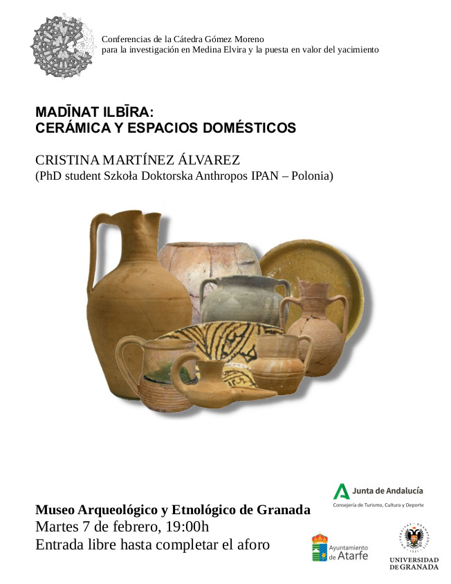 Conferencia «Madinat Ilbira: cerámica y espacios domésticos» impartida por Cristina Martínez Álvarez. Martes 7 de febrero, 19:00h, Museo arqueológico de Granada.