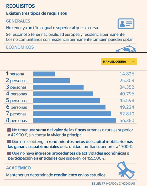 En el lado académico, se pide un nivel mínimo de asignaturas matriculadas y más de un 5 de nota en los estudios anteriores en algunos casos.