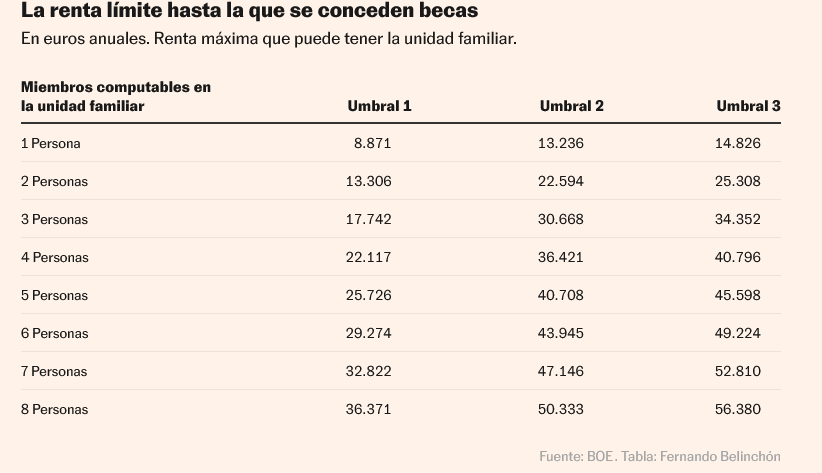Estos mismos umbrales no solo sirven para determinar si se tiene derecho o no a la beca, se usan para fijar la cuantía de la misma y las partidas a las que se puede optar. Explicándolo con un ejemplo.