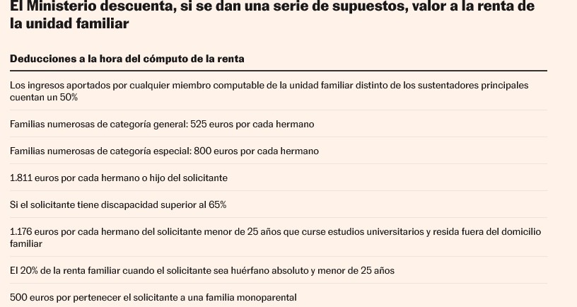 No obstante, hay que tener en cuenta que a la hora de calcular los anteriormente mencionados umbrales de renta el Ministerio fija una serie de deducciones.