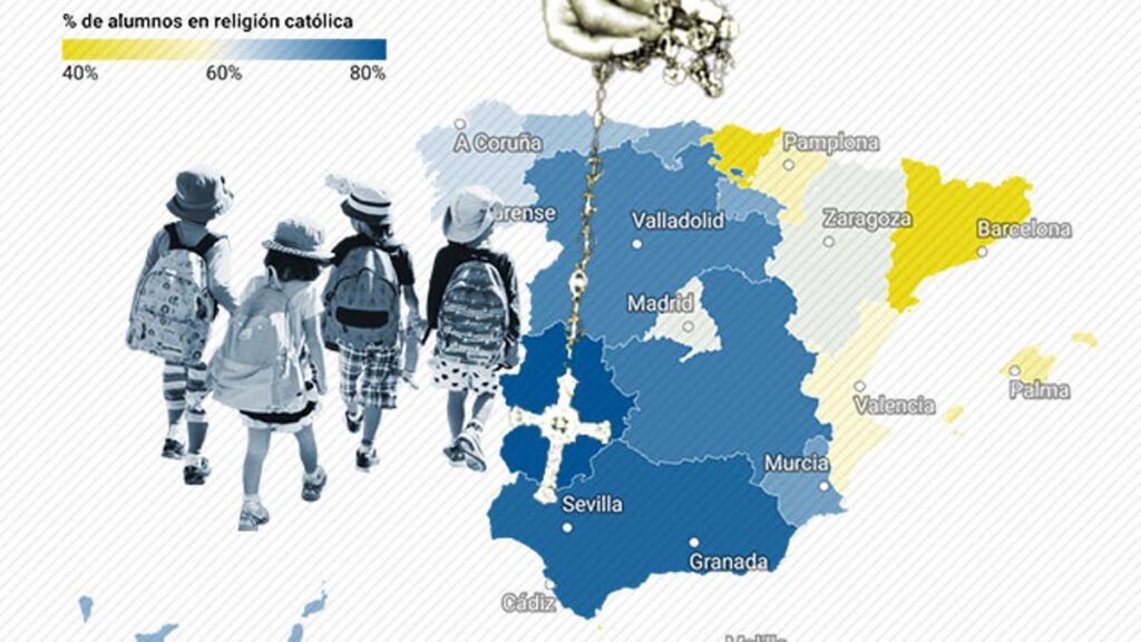 La Iglesia española suspende en Religión. También en la escuela. Por tercer año consecutivo, y en una dinámica que le ha llevado a bajar del 78,4% del curso 2002/01 al 57% actual, el número de los alumnos que escoge la asignatura de Religión católica en la enseñanza no universitaria ha vuelto a marcar un mínimo histórico.