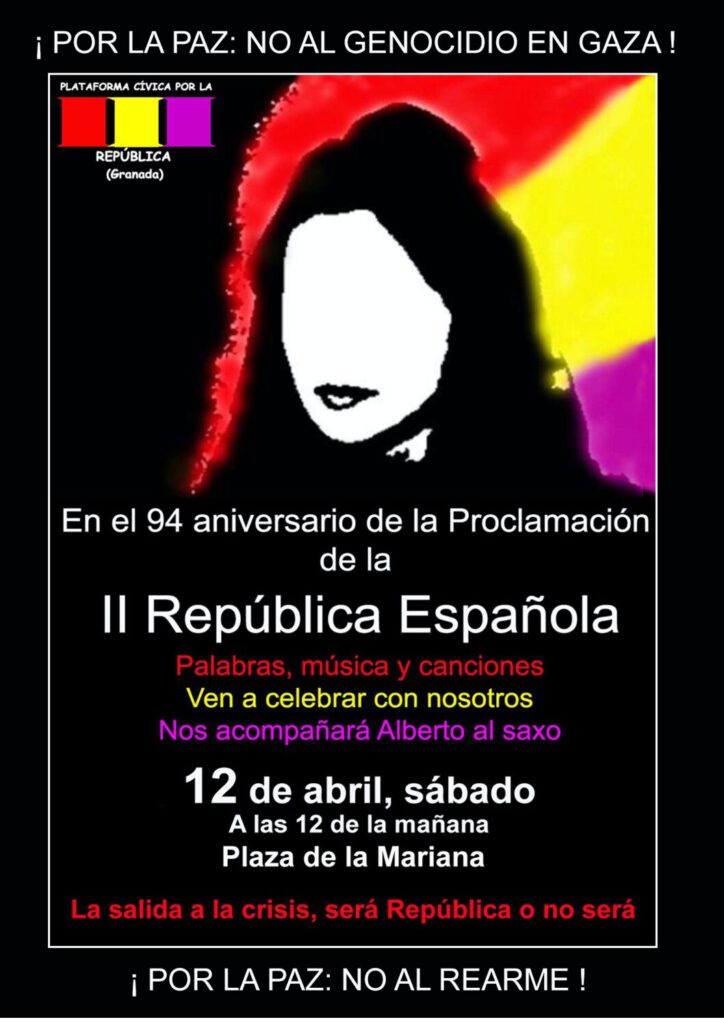 Como todos los años, la Asociación “Plataforma Cívica para la República” (Granada) conmemorará el aniversario de la proclamación el 14 de abril de 1931 de la II República Española. En esta ocasión, como el día 14 de abril resulta ser lunes de Semana Santa, se ha decidido adelantar la conmemoración al SÁBADO, 12 DE ABRIL, A LAS 12 HORAS, EN LA PLAZA DE LA MARIANA EN GRANADA.